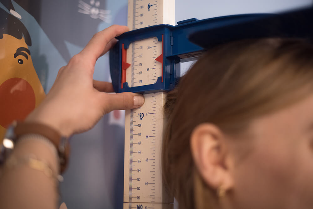 Pomiar wysokości – Prawidłowa pozycja to taka, gdy głowa, ramiona, pośladki i pięty dotykają urządzenia. Ręce powinny być ułożone luźno wzdłuż ciała, a głowa ułożona tak, by kanał ucha znajdował się w jednej linii z kością policzkową. Wzrost należy mierzyć bez butów, nakrycia głowy, ozdób we włosach itp.